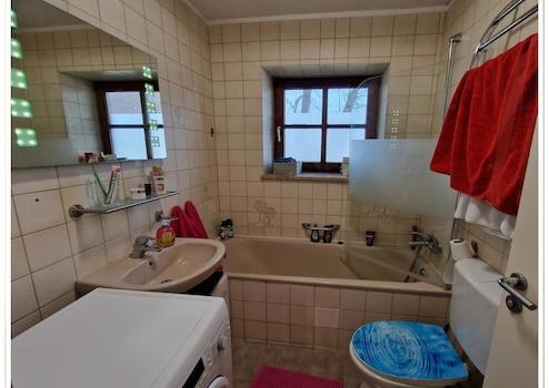 Das Bad ist mit einer Badewanne ausgestattet, hat einen Stellplatz für die Waschmaschine, und hat erfreulicherweise ein Fenster.