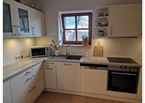 Die Küche ist mit einer ansprechenden Einbauküche ausgestattet.