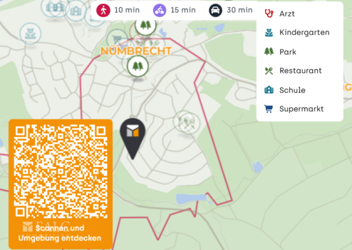 Alles Wichtige liegt nah beieinander: Einkaufsmöglichkeiten wie REWE und ALDI Süd sind in ca. 600 m erreichbar, ebenso die Drogerie dm. Für Familien ist das Umfeld praktisch, mit der Grundschule Nümbrecht in ca. 900 m sowie dem Homburgischen Gymnasium in ca. 900 m Entfernung. Auch Grünflächen kommen nicht zu kurz, der Kurpark Nümbrecht liegt in ca. 1 km Entfernung und lädt zu Spaziergängen und Erholung im Kurort-Ambiente ein.