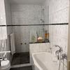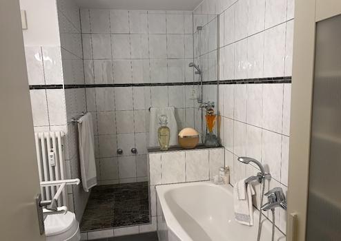 - neues Duschbad mit bodentiefer Dusche, großformatigen, anthrazitfarbenen Bodenfliesen und hellen Wandfliesen