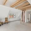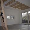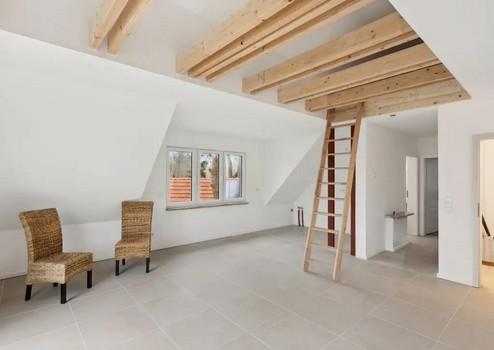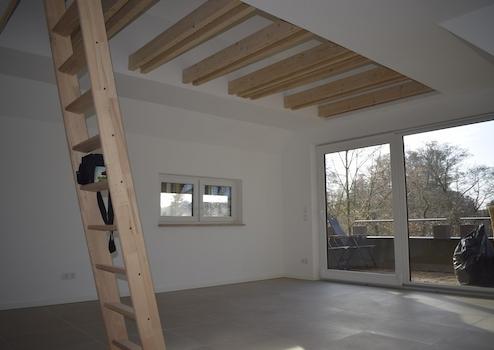 - Wohnraum mit offen ausgebautem Dachstuhl, sichtbare Dachbalken