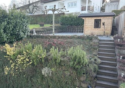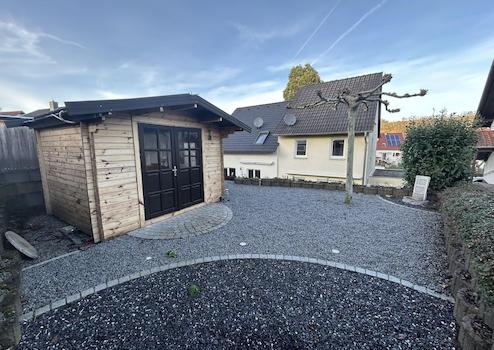 Der liebevoll angelegte Garten lädt zum Entspannen, Spielen oder Gärtnern ein. Die große Terrasse ist mit einer elektrischen Markise ausgestattet, die sowohl Sonnenschutz als auch ein hohes Maß an Privatsphäre bietet. Ein Gartenhaus mit Stromanschluss (ca. 2 × 2,5 m) ergänzt das Platzangebot ideal. Die große Dachplatane ist der natürliche Schattenspender im Sommer.