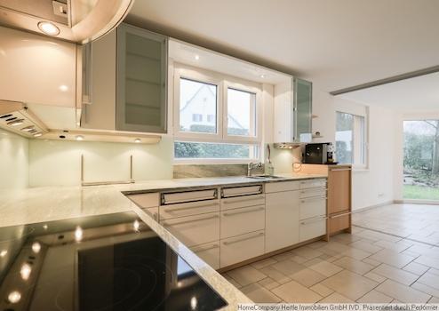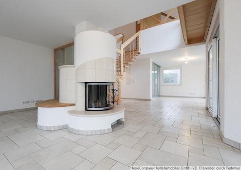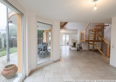 sowie rollbaren Glastüren, Essbereich mit Verbindung zum großes Wohnzimmer mit Kamin sowie Zugang zur Terrasse mit Garten.