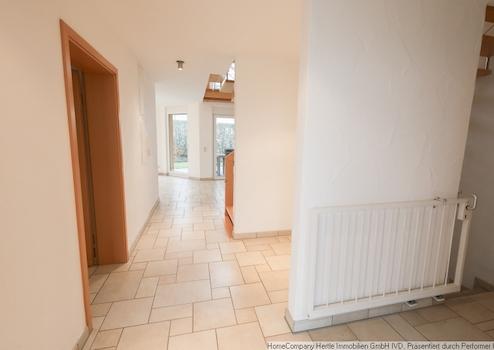Das 1.Obergeschoss im Eingangsbereich mit Windfang, Gästezimmer, Bad mit Dusche/WC, große offene Küche mit hochwertiger Einbauküche