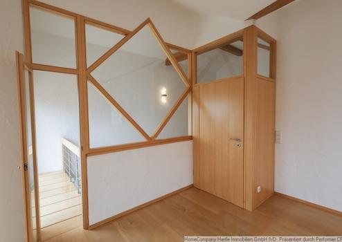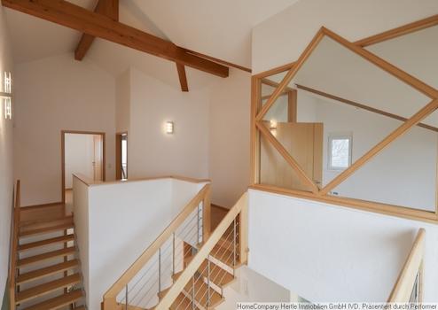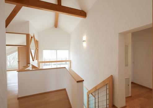 Über die zentral im Gebäude platzierte Holztreppe gelangt man über 2verschiedene Treppenläufe in das Dachgeschoss,