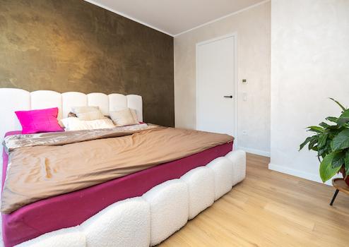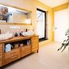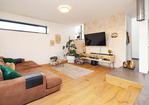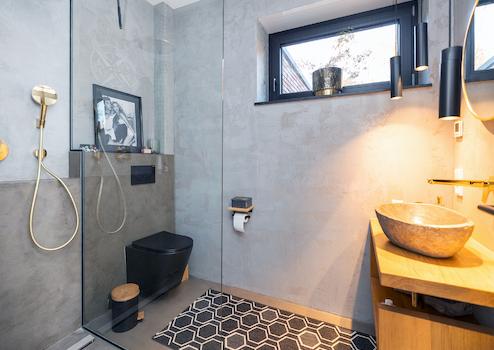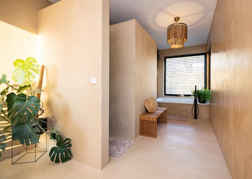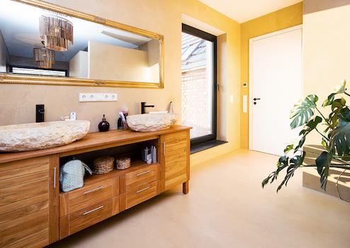 Nun zum Highlight: das großzügige Badezimmer mit ebenerdiger Dusche und Badewanne. Hier ist eine echte Wellnessoase entstanden, die viel Ruhe und Wärme ausstrahlt. Der perfekte Ort, um nach Feierabend zu entspannen.