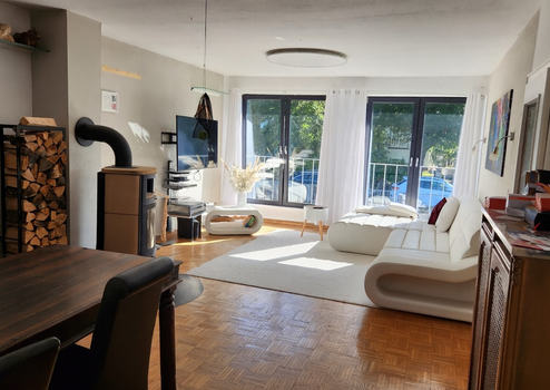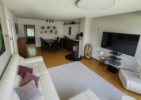 Der variable Grundriss ermöglicht verschiedene Nutzungskonzepte: klassisches Familienwohnen, Mehrgenerationenwohnen, Homeoffice oder Nutzung des Einliegerbereichs für Gäste oder berufliche Zwecke. Der helle Wohnbereich mit großer Fensterfront und Kaminofen bietet ein angenehmes, gemütliches Wohnambiente. Terrasse und Garten bieten viel Raum für Ruhe, Freizeit und Erholung.