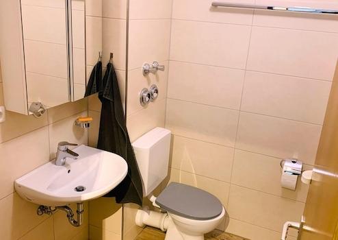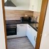 Einbauküche und ein modernes Badezimmer mit Duschbadewanne. Darüber hinaus sind sowohl ein privates