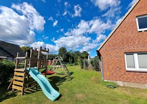 Das gepflegte Grundstück bietet Gartenliebhabern vielfältige Gestaltungsmöglichkeiten. Die Grünflächen - inkl. Klettergerüst - laden Kinder zum Spielen und Toben ein.