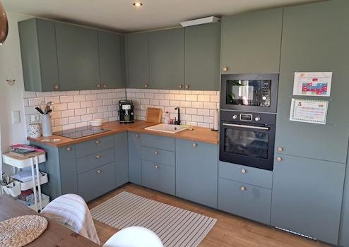 Beim Betreten des Hauses empfängt Sie ein einladender Eingangsbereich mit ausreichend Platz für eine Garderobe. Linker Hand gelangen Sie direkt in den großzügigen Wohn-, Ess- und Küchenbereich. Die 2023 eingebaute Küche entspricht modernen Standards und fügt sich harmonisch in das Raumkonzept ein. Große Fensterflächen sorgen für viel Tageslicht und eine freundliche Atmosphäre. Eine neu eingesetzte Terrassentür ermöglicht den direkten Zugang in den Garten.