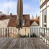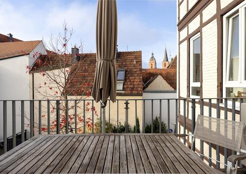 Ein großer Balkon mit Blick in den ruhigen Innenhof/Garten, sowie die Aussicht auf die Dächer der Altstadt und den Haardtrand sind ein weiteres Highlight.