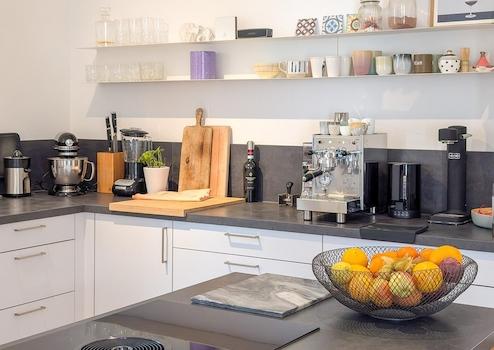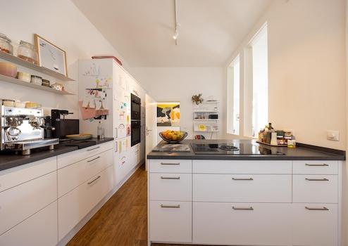 Die moderne, offene und vollausgestattete Einbauküche mit hochwertigen Geräten ist im Kaufpreis inbegriffen.