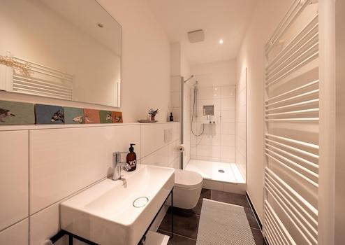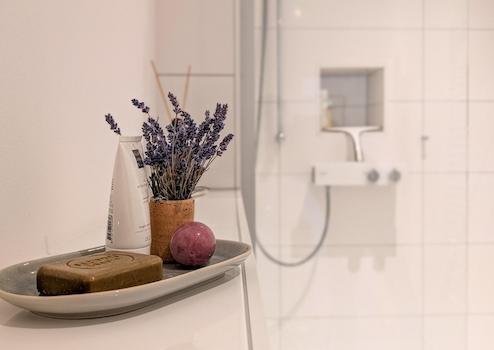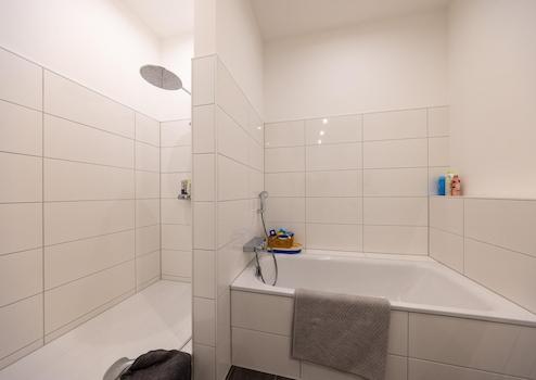 Die beiden Badezimmer sind zeitlos gefliest und wurden 2020 nachträglich mit modernen Sanitärmöbeln ausgestattet.