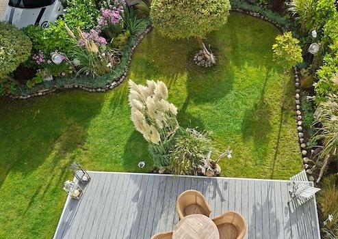 Sonniger Traumgarten: Perfekt ausgerichtete 20 m² Südterrasse mit hochwertigen Dielen und elektrischer Markise in Lichtgrau
