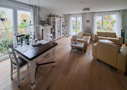 Kompromisslos hochwertige Ausstattung: Edles Eichenparkett, gemütliches weiß/graues Laminat, Nolte-Einbauküche mit Markengeräten, modernes Bad mit Fußbodenerwärmung, edle Buchentreppe und bodentiefe Fenster