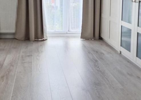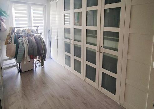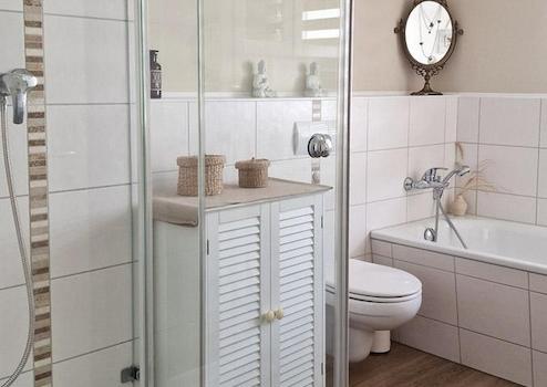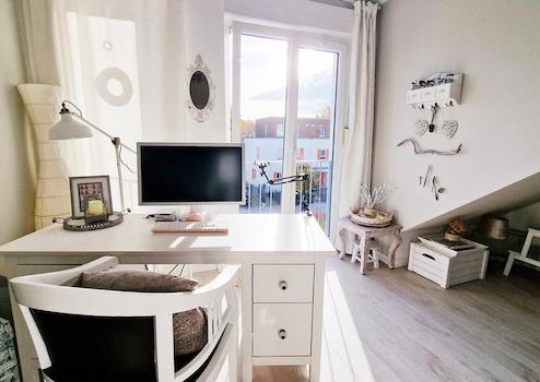 Eine harmonische Buchentreppe mit weißen Setzstufen führt Sie nach oben. Hier finden sich aktuell zwei großzügige Zimmer mit hellem Laminat in Eiche-Optik (Arctic-weiß von Meister). Die durchdachte Planung erlaubt es, durch eine einfache Teilung drei separate Zimmer zu schaffen, um so flexibel auf Ihre familiären Bedürfnisse reagieren zu können. Das moderne Bad ist eine kleine Wellness-Oase mit geregelter Fußbodenerwärmung, edlen mattweißen Wandfliesen (Kerateam Stucco), Natursteinmosaiken und einer rahmenlosen Glas-Duschabtrennung.