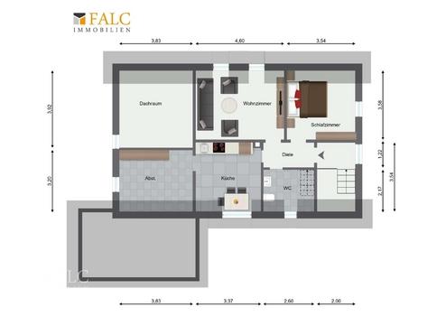 Das Dachgeschoss verfügt über eine separate Wohneinheit mit eigenem Zugang über eine zweite Eingangsdiele. Die Räume umfassen ein Wohnzimmer, ein Schlafzimmer, eine Küche, ein WC sowie einen Abstellraum. Zusätzlich besteht Zugang zum Dachboden, der als Lagerfläche genutzt werden kann.