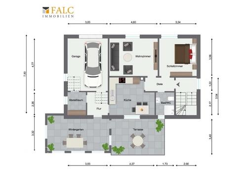 Im Erdgeschoss des voll unterkellerten Hauses befindet sich eine helle Eingangsdiele, die in einen zentralen Flur übergeht. Von hier aus sind alle Räume erreichbar: ein modernisiertes Badezimmer, ein Schlafzimmer, ein großzügiges Wohnzimmer, eine Küche sowie ein praktischer Abstellraum. Ein besonderes Highlight ist der 1995 angebaute, lichtdurchflutete Wintergarten mit direktem Zugang zur Terrasse und zum Garten.