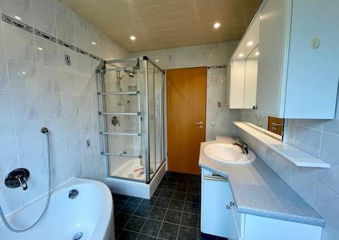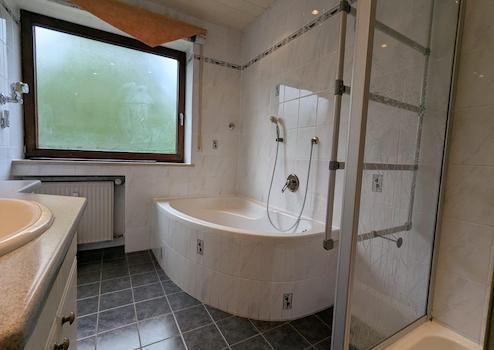 •Badezimmer mit Fenster, Eckbadewanne und Dusche