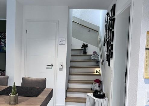 Die Eiche - Massivholztreppe führt ins Obergeschoss mit 3 Schlafzimmern und einem Wellnessbad mit freistehender Badewanne und einer Walk- In- Dusche.