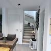 In diesem KfW- 40- Energiesparhaus liegen überall auf einer Fußbodenheizung hellgraue Fliesen in edler Natursteinoptik, die sich auch an den Wänden der Bäder wiederfinden.