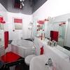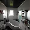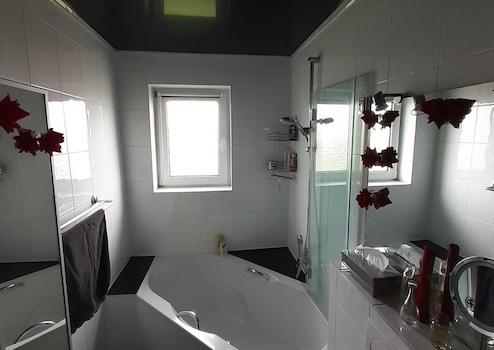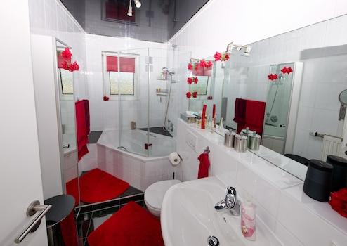 Im weiß gefliesten Tageslichtbad befindet sich eine große Badewanne, ein schwarzer Granitboden und eine schwarze Spanndecke. Die Armaturen sind hochwertig von Grohe, Waschbecken, WC von Villeroy und Boch, die Badewanne von Duscholux. Als Spritzwasserschutz beim Duschen wurde eine maßgefertige Glaswand von Heiler eingebaut.