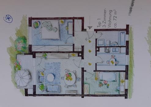 72,1 qm Wohnfläche verteilen sich auf 3 Zimmer, Küche, Tageslichtbad, Abstellraum und Balkon. Die Wohnung hat eine sehr praktische Aufteilung und jede Menge Stauraum.
