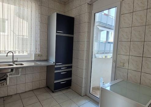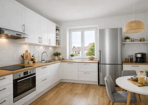 Die Einbauküche wird aktuell durch Vermieter einem Upgrade unterzogen und mit einem größeren Kühlschrank ausgestattet, sodass sie zeitgemäßen Ansprüchen voll entspricht. Eine Visualisierung der möglichen Umgestaltung ist in der Anzeige enthalten.
