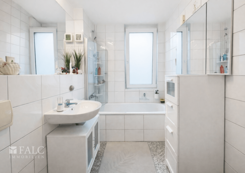 Das Tageslichtbad ist zeitlos gestaltet und verfügt über eine Badewanne, eine separate Dusche sowie ein Fenster für natürliche Belichtung und gute Lüftungsmöglichkeiten.