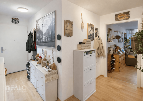 Über den gepflegten Gemeinschaftsbereich erreichen Sie Ihre Wohnung im Erdgeschoss. Der Eingangsbereich empfängt Sie mit einem funktionalen Flur, der als zentrale Verbindung zu allen Räumen dient und praktische Stellflächen für Garderobe und Alltagsutensilien bietet. Kurze Wege und eine klare Aufteilung sorgen für einen harmonischen Ablauf im täglichen Leben.