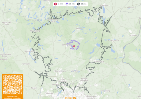 Alltagswege bleiben dennoch entspannt: Zehdenick bietet Einkaufsmöglichkeiten, Schulen, Medizin und Regionalbahn-Anschluss; Berlin erreichen Sie mit dem Auto je nach Ziel und Verkehr in ca. 60–80 Minuten (B96/A111). Ab Zehdenick besteht Regionalbahnanschluss Richtung Oranienburg/Berlin mit Fahrtzeiten von grob 70–110 Minuten je nach Verbindung.