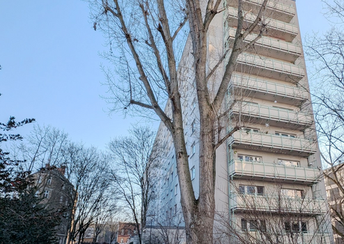 Die Wohnung liegt im obersten Stockwerk (10. Etage). Der Aufzug fährt bis in den 9. Stock, von dort führt eine kurze Treppe zur Wohnung. Pro Etage befinden sich lediglich zwei Eigentumswohnungen, was ein hohes Maß an Ruhe und Privatsphäre bietet.