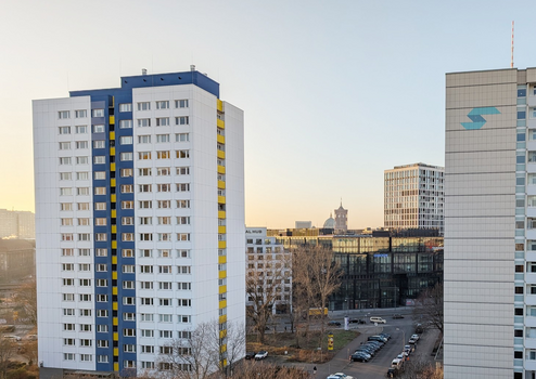Mit 102,45 m² Wohnfläche überzeugt die Wohnung durch einen effizienten Grundriss, einen außergewöhnlich großen Westbalkon über zwei Zimmer sowie eine weite, unverbaute Aussicht mit Blick auf das Rote Rathaus und den Alexanderplatz. Dank der Westausrichtung genießen Sie hier spektakuläre Sonnenuntergänge – echtes Penthouse-Feeling.