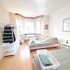 ein großzügiges Wohnzimmer mit Zugang zum Balkon,
