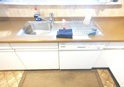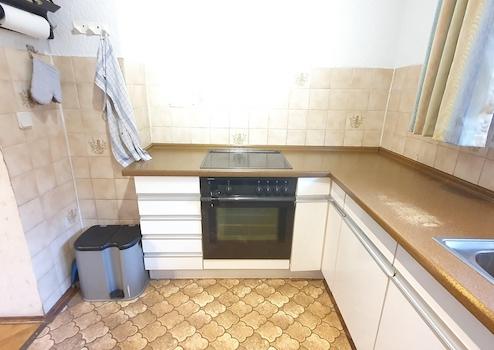 Voll ausgestattete Einbauküche: Herd, Backofen, Kühlschrank, Kaffeemaschine, Wasserkocher, Geschirr & Besteck