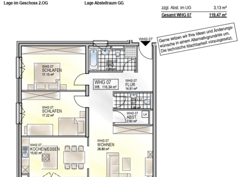 Das Angebot bezieht sich auf die Wohnung 7 im 2. Obergeschoß - hangseitig 3. Obergeschoß. Sie gelangen über eine geräumige Diele mit Garderobe in die Wohnung. Von der Diele gelangen Sie in das geräumige Bad mit Fenster von ca. 8 m² ausgestattet mit Dusche und Wanne, das gut aufgeteilte Elternschlafzimmer von ca. 17 m², das helle geräumige Kinderzimmer/Büro von ca. 15 m², das Gäste-WC sowie in den Abstellraum. Von der zentralen Diele gelangen Sie desweiteren in den hellen großzügigen Wohn/Eßbereich mit offener Küche von insgesamt 48 m² und Ausgang auf den großen sonnigen Balkon von ca. 18 m². Von hier haben Sie eine herrliche Sicht ins Tal und über die Stadt Koblenz. Der Kochbereich kann auf Wunsch abgetrennt werden. Die Wohnung hat eine Wohnfläche von ca. 117 m². Der Wohnung ist ein Kellerraum zugeordnet.