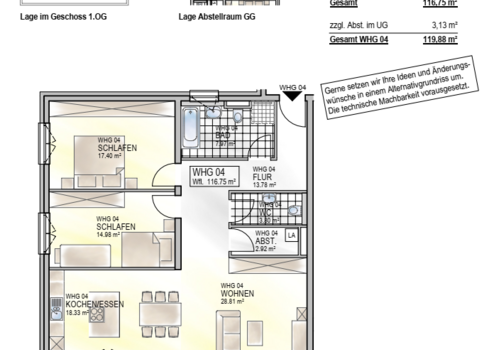 Das Angebot bezieht sich auf die Wohnung 4 im 1. Obergeschoß - hangseitig 2. Obergeschoß. Sie gelangen über eine geräumige Diele mit Garderobe in die Wohnung. Von der Diele gelangen Sie in das geräumige Bad mit Fenster von ca. 8 m² ausgestattet mit Dusche und Wanne, das gut aufgeteilte Elternschlafzimmer von ca. 17 m², das helle geräumige Kinderzimmer/Büro von ca. 15 m², das Gäste-WC sowie in den Abstellraum. Von der zentralen Diele gelangen Sie desweiteren in den hellen großzügigen Wohn/Eßbereich mit offener Küche von insgesamt 48 m² und Ausgang auf den großen sonnigen Balkon von ca. 18 m². Von hier haben Sie eine herrliche Sicht ins Tal und über die Stadt Koblenz. Der Kochbereich kann auf Wunsch abgetrennt werden. Die Wohnung hat eine Wohnfläche von ca. 117 m². Der Wohnung ist ein Kellerraum zugeordnet.