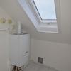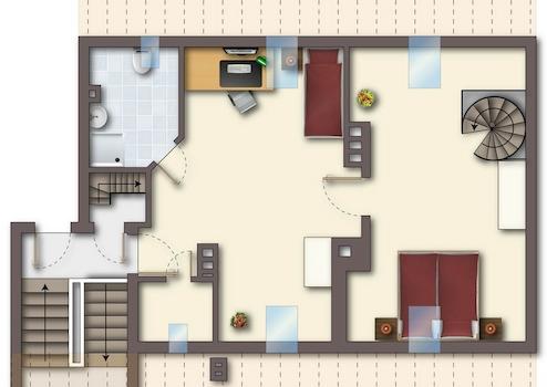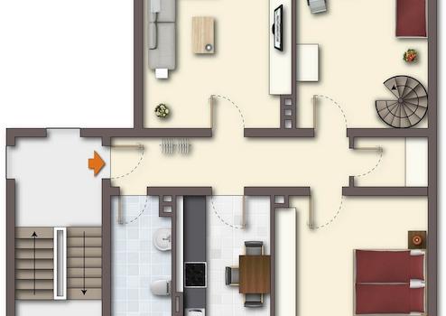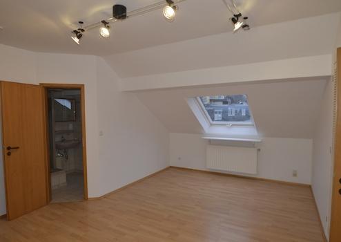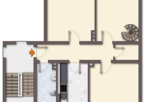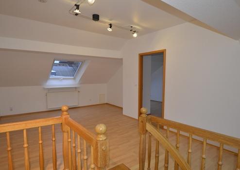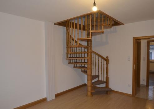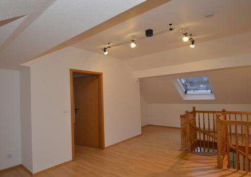 Im hinteren Raum der unteren Ebene führt eine Wendeltreppe in die obere Ebene. Hier finden sich auf ca. 51 m² zwei weitere große Zimmer mit schöner Fernsicht, sowie ein Dusch-Bad (ebenfalls mit Tageslicht) und ein zweiter Abstellraum. Die leichten Dachschrägen machen diese Ebene zu einem gemütlichen Rückzugsort. Velux Dachfenster z.T. mit Solar-Rollladen Funktion bieten hier zusätzlich Schutz für ein ideales Raumklima zu jeder Jahreszeit. Der obere Wohnbereich verfügt über eine separate Wohnungseingangstür und kann somit z.B. als Büro genutzt werden. Die gesamte Wohnung ist frisch renoviert; die Wohnbereiche sind mit pflegeleichten Hartböden (Laminat und Parkett) ausgestattet.