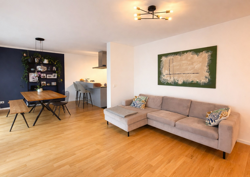 In allen Wohnräumen ist hochwertiger Parkettboden verlegt, der eine zeitgemäße und wohnliche Atmosphäre schafft. Die moderne Einbauküche ist mit neuen Elektro-Markengeräten ausgestattet und fügt sich harmonisch in den offenen Wohnbereich ein.