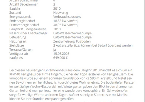 Bei diesem neuwertigen Einfamilienhaus aus dem Baujahr 2010 handelt es sich um ein KFW 40 Fertighaus der Firma Fingerhut, einer der Top-Hersteller von Fertighäusern. Die Immobilie wurde auf einem sonnigen Grundstück von ca. 580 m2 erstellt und bietet seinen Bewohnern ein herrliches, lichtdurchflutetes Wohnerlebnis. Die bodentiefen Fenster im weitläufigen Wohn-/Essbereich mit Wintergarten geben den Blick in den charmanten Garten frei und man geniesst hier eine wunderbare Atmosphäre. Ein Schwedenofen sorgt für wohlige Wärme an kalten Tagen. Auf der sonnigen Südterrasse mit Markise können Sie Ihre Stunden entspannt genießen.