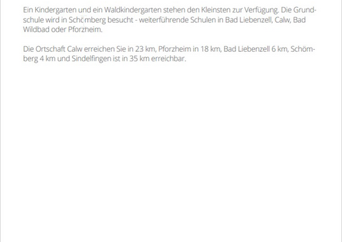 Die Ortschaft Calw erreichen Sie in 23 km, Pforzheim in 18 km, Bad Liebenzell 6 km, Schömberg 4 km und Sindelfingen ist in 35 km erreichbar.