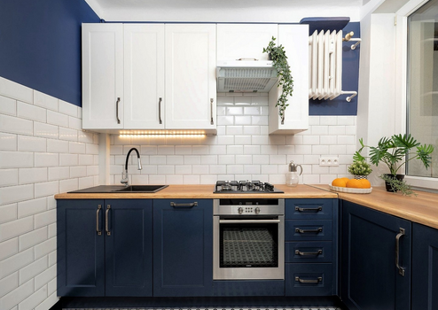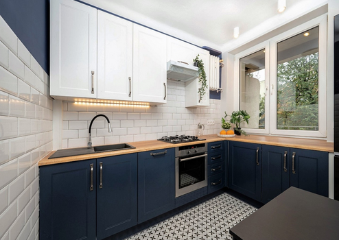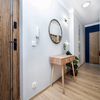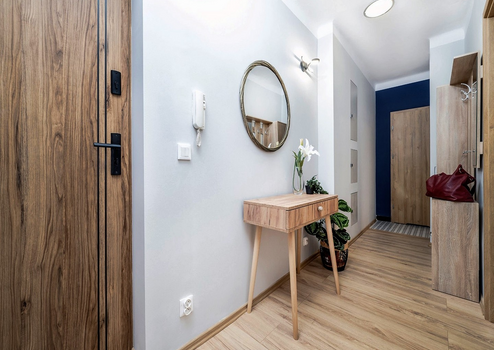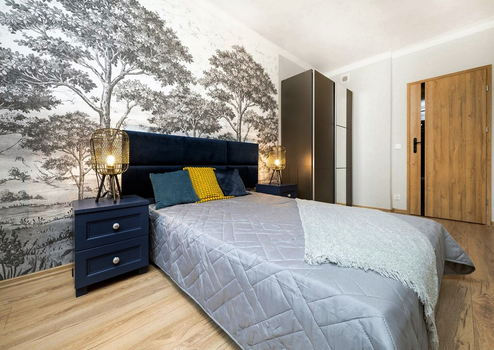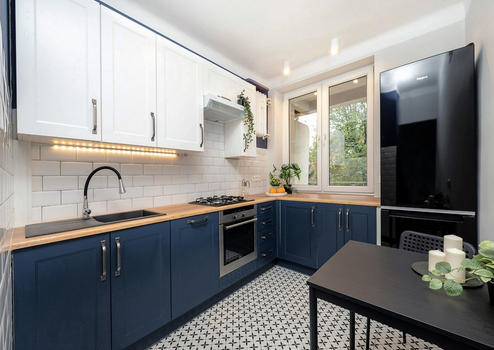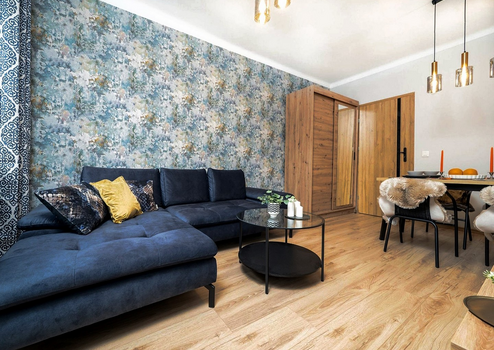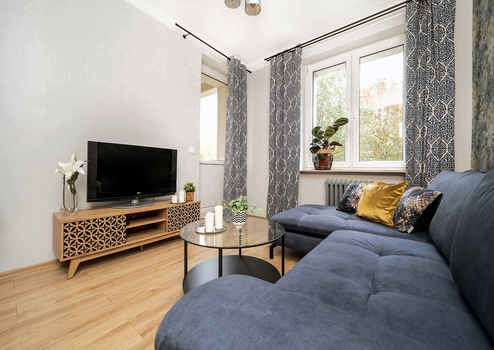Eine moderne 2-Zimmer-Wohnung nach der allgemeinen Renovierung mit neuen Möbeln.