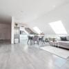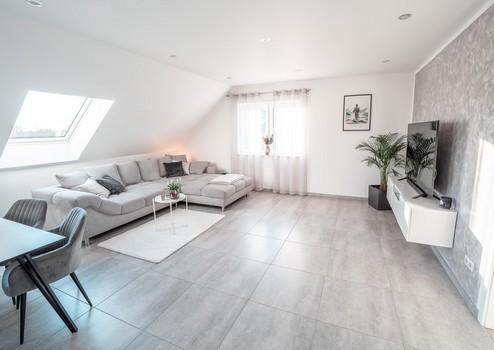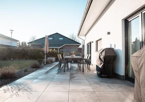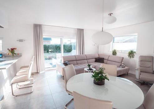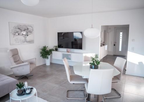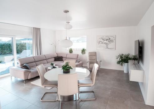 Der offene Wohn- und Essbereich bildet das Herzstück des Hauses und bietet direkten Zugang zur großzügigen, ca. 54 m² großen Terrasse.