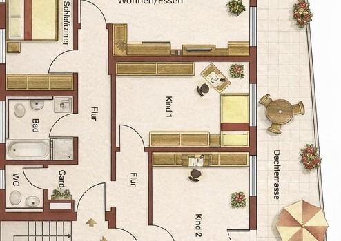 Die attraktive und großzügig geschnittene 4-Zimmer-Wohnung bietet auf ca. 133 m² Wohnfläche viel Platz für Familien oder Paare mit Homeoffice-Bedarf. Besonders hervorzuheben ist die große Dachterrasse, die zusätzlichen Wohnkomfort im Freien schafft.