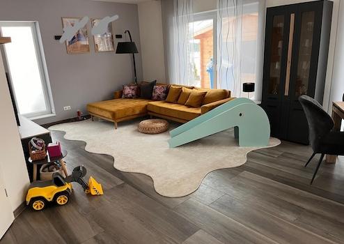 Die offene Gestaltung schafft eine helle, freundliche Atmosphäre und fördert das gemeinsame Familienleben. Fensterflächen zu jeder Himmelsrichtung sorgen für viel Tageslicht und eine angenehme Wohnqualität.