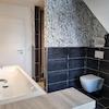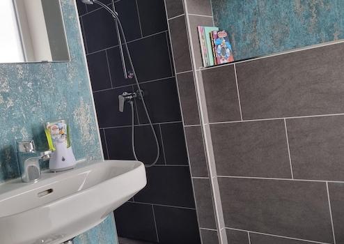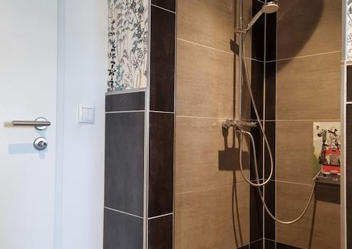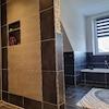 Das Gäste WC verfügt über eine Bodentiefe, Dusche und ist modern gefliest.