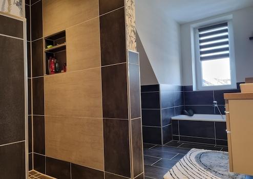 - Beide Bäder mit bodentiefer Dusche, nebst Wannenbad im OG