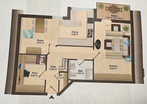 - Balkon (5,23 m² / 2,61 m² anrechenbar) nach Osten