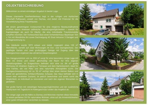 Das bestehende Zweifamilienhaus wurde 1972 erbaut und bietet insgesamt etwa 139 m² Wohnfläche, verteilt auf zwei Wohnungen im Erd- und Dachgeschoss. Der gepflegte Garten und zwei großzügigen Garage mit Zugang über das Kellergeschoss ergänzen das Gesamtangebot.