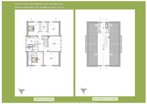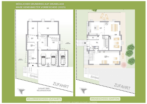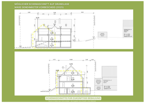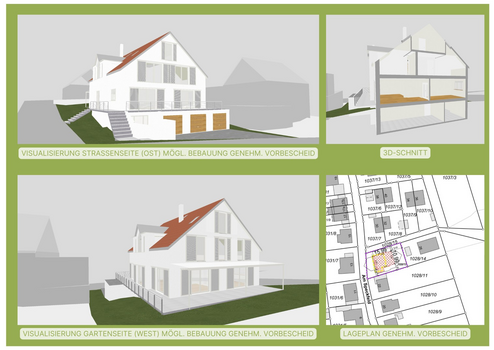 Der Vorbescheid lässt einen Wohnhaus-Baukörper 15m x 11m mit Wandhöhe 6m sowie Dachneigung 45 Grad inklusive 3 Garagen und Einliegerwohnung zu.